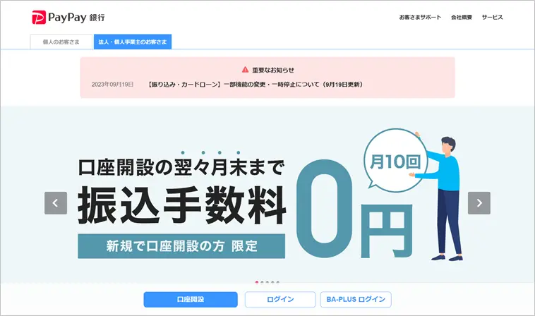 デビット決済を手数料・金利0%で利用できる「デビット後払いオプション」、決算書不要で申し込めるビジネスローンなど、急な資金ニーズに対応できるサービスも用意されていて、非常に使い勝手のいいネット銀行です。
