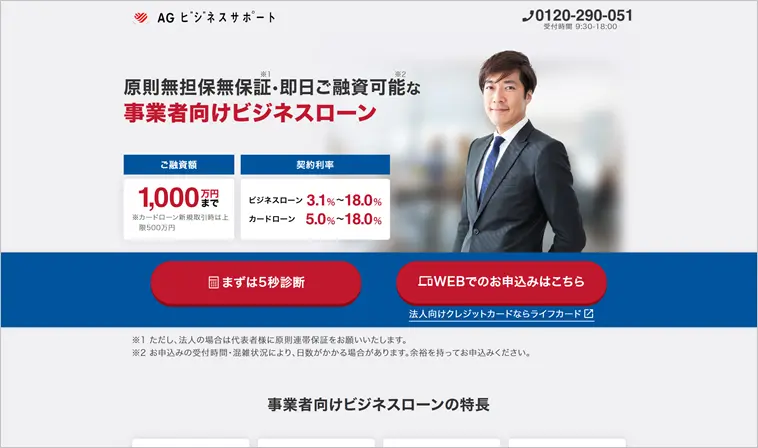 AGビジネスサポートは、最大1,000万円の借入が可能なビジネスローンです。AGビジネスサポート株式会社がサービス提供しています。