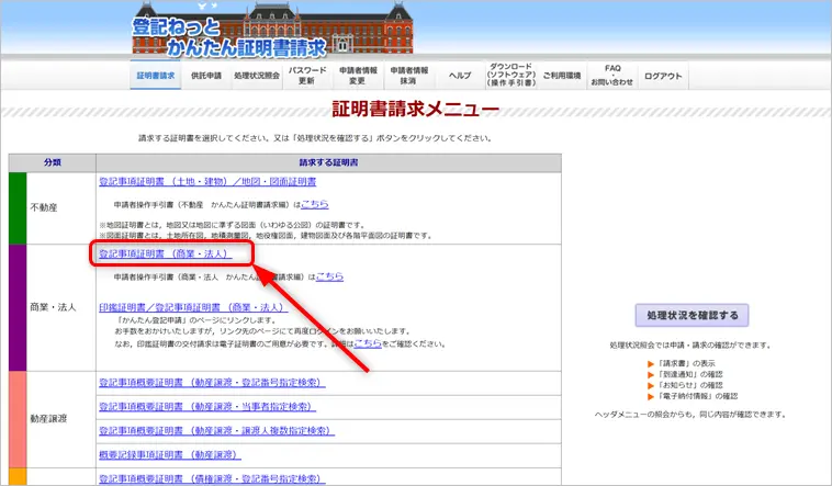 ログインすると「証明書請求メニュー」が表示されますので、取得したい証明書をクリックします(今回は商業登記簿謄本で解説します)。
