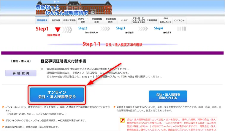登記簿謄本をオンライン申請するやり方・手順は下記のとおりです。