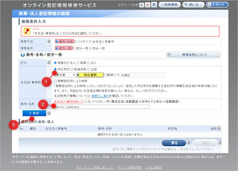 商業・法人登記情報の検索画面が表示されますので、取得したい会社情報を入力します。