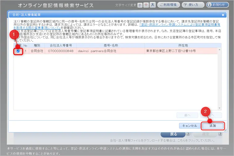 表示された会社情報を確認し、会社名と所在地に間違いなければ、①チェックボックスにチェックを入れて、②「追加」をクリックします。
