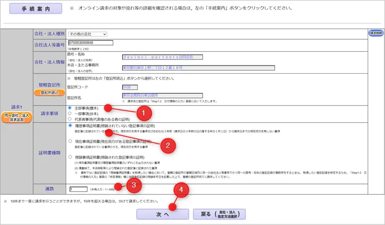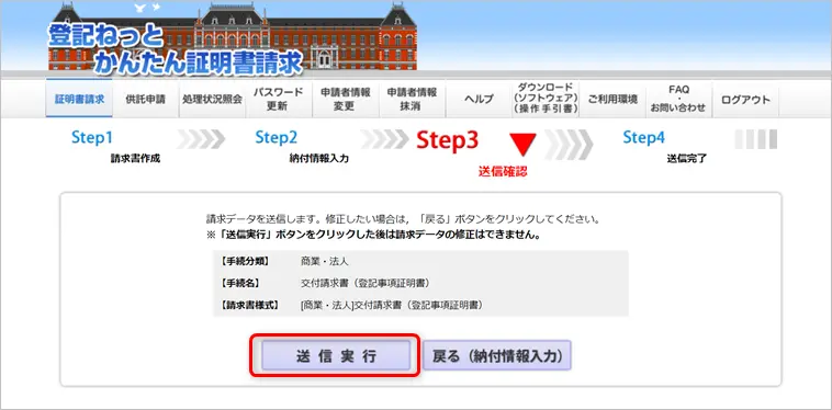 「確定」をクリックすると登記簿謄本の申し込み画面に移動します。