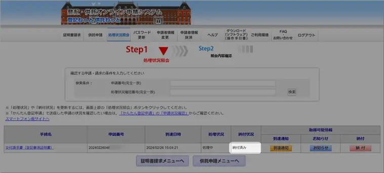 決済が完了すると、ステータス画面の納付状況が「納付済み」と表示されます。