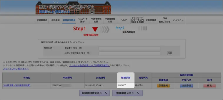 手続きの進捗状況は「処理状況を確認する」をクリックすると確認できます。